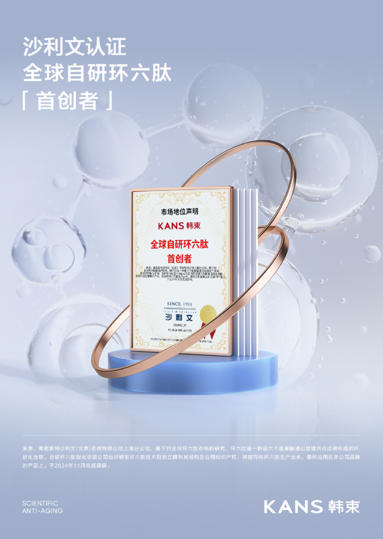 业绩公告显示,2024年上美研发投入超1.8亿元,同比增加43%。其中自主研发成分环六肽-9通过新原料备案,不仅成为功效护肤领域全球首个品牌自研环六肽,也代表着韩束科研实现了从「线性肽」到「环肽」的分子结构突破,完成「生物制药」向「美妆护肤」的跨学科技术迁移。凭借此项突破,韩束斩获权威机构沙利文认证「全球自研环六肽首创者」,推动行业进入自研原料的品质红利时代。