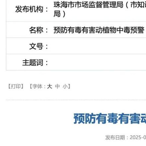 近日,珠海市市场监督管理局发布预警,提醒广大市民预防有毒有害动植物中毒。详情如下: