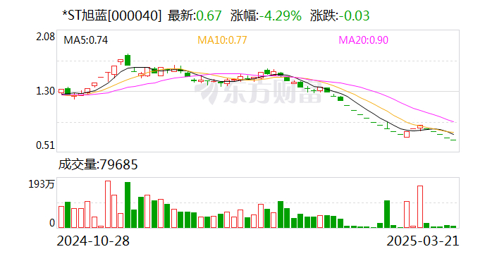 证券时报·数据宝统计显示,*ST旭蓝今日收盘价为0.67元,下跌4.29%,日换手率为0.76%,成交额为533.89万元,全天主力资金净流出83.21万元,近5日该股累计下跌22.09%,近5日资金合计净流出1390.90万元。