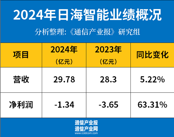 【通信产业网讯】(记者 崔亮亮)3月21日,日海智能发布2024年年度报告,2024年营业收入为29.78亿元,同比增长5.22%。净利润亏损为1.34亿元,上年亏损3.65亿元,同比收窄63.31%。