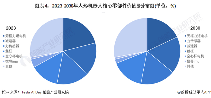 根据Tesla AI Day的数据,以特斯拉Optimus为例,2023年人形机器人核心零部件价值量排名前三的是无框力矩电机、减速器和力传感器;而2030年,无框力矩电机价值量占比下降,力传感器、减速器价值量占比上升,且力传感器将超过减速器,排名第二,三者合计占比仍超过50%。