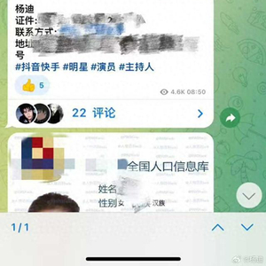 主持人杨迪发文称自己被“开盒”,图为外网“电报群”中杨迪的隐私信息。图源杨迪微博