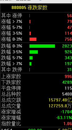 市场共996只个股上涨,56只个股涨停,4289只个股下跌。