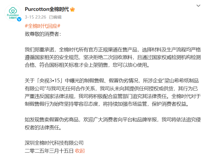 全棉时代则发布公告,郑重承诺其所有官方正规渠道在售产品,选择材料及生产流程均严格遵循国家相关的安全规范,坚决拒绝二次回收原料,且通过国家权威检测机构检测合格、符合国标相关标准才会上架销售,对于制假售假行为始终坚持零容忍态度。