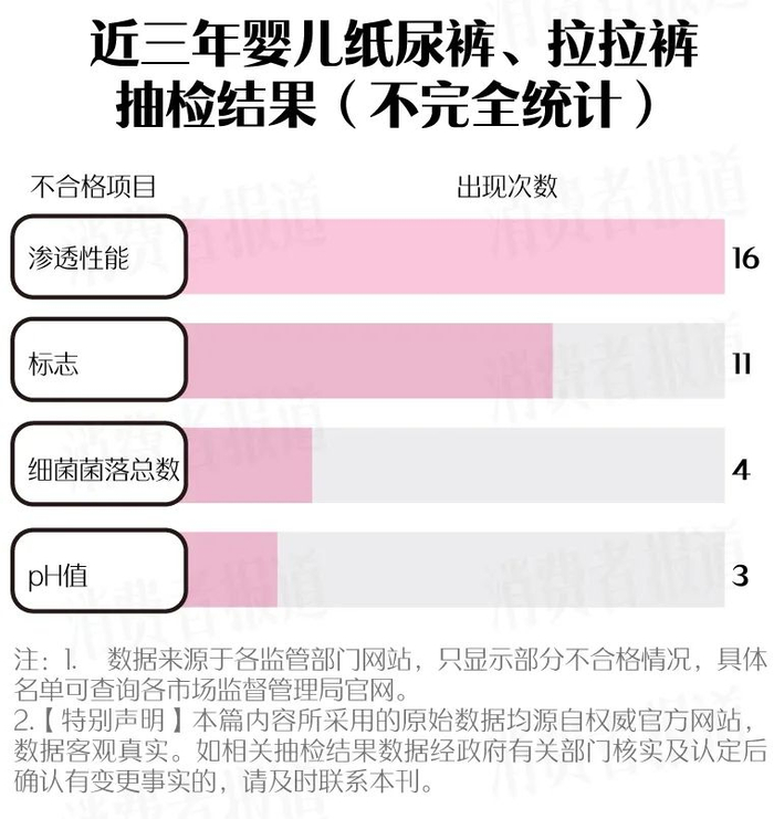 婴儿纸尿裤第二大“翻车”项目为标志,近三年抽检共计11批次不合格。该项目不合格可能会在产品使用上误导消费者。