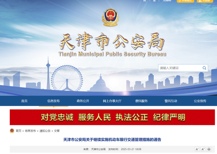 今天(3月21日),天津市公安局网站发布《天津市公安局关于继续实施机动车限行交通管理措施的通告》,经市人民政府批准,自2025年3月31日至2026年3月29日,我市继续实施机动车限行交通管理措施。