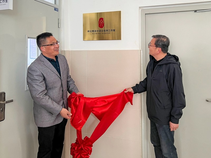 在热切的瞩目与热烈的掌声中,揭牌仪式正式拉开帷幕。孙国岩和朱建军共同为杨文惠名师工作室揭牌,红绸轻扬间,“杨文惠名师工作室”的金色牌匾熠熠生辉,标志着学校“名师引领、教研共生”战略迈出关键步伐。