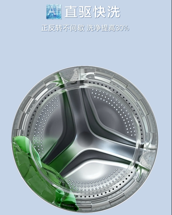 比如快洗程序,传统洗衣机每次切换正转和反转,都要停顿一会儿,洗洗停停;而海尔AI直驱不仅正反转切换不停顿,还能通过AI智控算法快速识别筒内衣物的状态,实时调整成最佳洗涤轨迹,同样15分钟,我们的洗净比能提升30%。