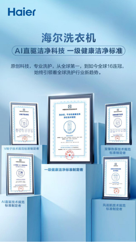 在健康洁净领域,海尔早先就主导制定《健康洁净标准》,填补了行业空白。今年进一步升级,先后主导制定《AI直驱洗衣机标准》、《滚筒洗衣机风巡航功能技术规范》等多项标准,在AI应用、创新技术与产品等多个领域做出表率,并为行业的升级进化指明了方向。