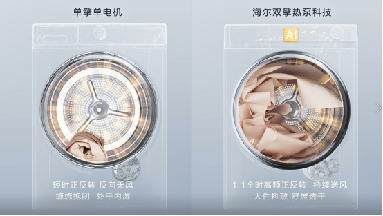 除了洗衣机,海尔干衣机的烘干科技也有了升级。以前干衣机烘不透,容易缠绕打结,而现场升级的AI双擎热泵科技,利用独立双电机与1:1全时正反转技术,将衣物均匀抖散,加上 “3D透视眼”实时检测干湿度,让衣服烘得刚刚好。