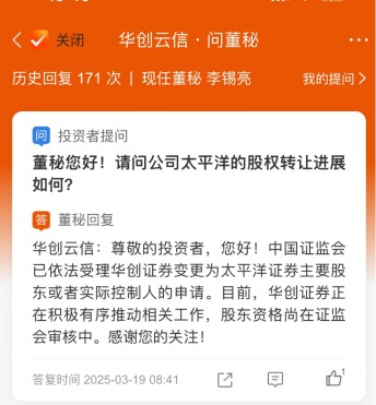 3月19日,上证e互动显示,华创云信在回答近一个月前的投资者提问时表示,证监会已依法受理华创证券变更为太平洋证券主要股东或者实际控制人的申请。目前,华创证券正在积极有序推动相关工作,股东资格尚在证监会审核中。