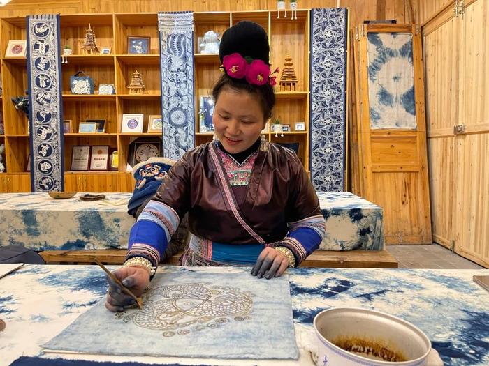 黎平侗品源传统工艺农民专业合作社负责人陆勇妹在制作蜡染。本报记者骆飞摄