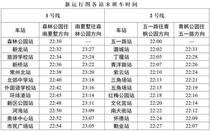 如遇节假日及大型活动,常州地铁将根据客流需求动态进行运营调整。另因3月22日、23日新龙生态林举办“2025新龙森林音乐节”,在此期间1、2号线末班车均为23:00。
