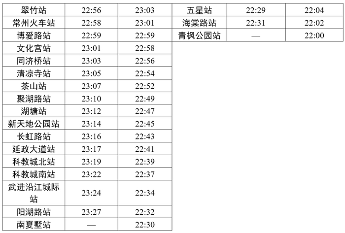 答:常州地铁对日常客流进行深入调研分析,22:00后,日均进站客流750人次,其中,1号线650人次,2号线100人次,1号线换乘2号线客流110人次,22:30后1号线进站客流150人次。常州火车站、常州北站、武进沿江城际站22:30后日均进站客流为110人次。地铁是大运量公共交通,为了避免运力浪费,考虑运营成本,结合整体客流、换乘需求及火车站接驳情况综合研判,将1号线末班车调整至22:30,2号线末班车恢复至22:00。地铁停运后,建议仍有出行需求的乘客可以选择其他交通方式出行。