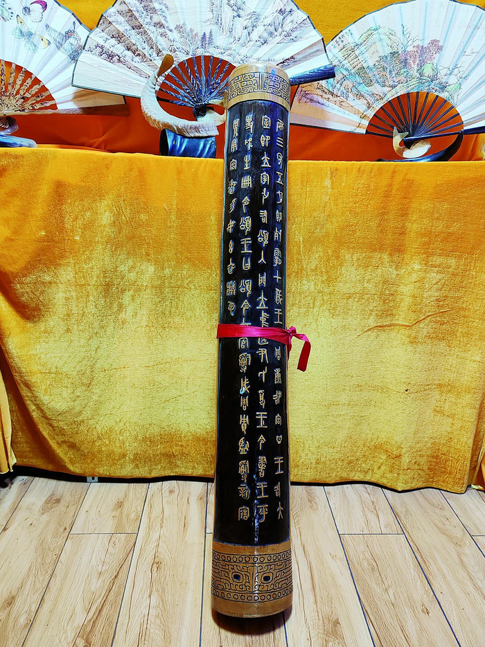 “松竹轩扇庄”由著名书法家马悦书写,挂扇下面的长桌上摆放着长短大小不一的楠竹镂刻扇箧,古色古香,与马悦先生的书法相映成趣。大的扇箧有一米多长,打开有60多厘米宽。陈子福说:“工艺折扇是荣昌折扇传承发展的历史和时代必然,我用楠竹做扇盒,镂刻各种花纹,扇盒与扇盒完美结合,更具观赏和收藏价值。”