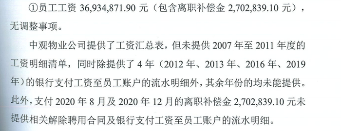 审计报告显示,中观物业仅提供了4年的银行支付工资流水明细,而针对上述离职补偿金并没有提供解聘合同与支付流水。