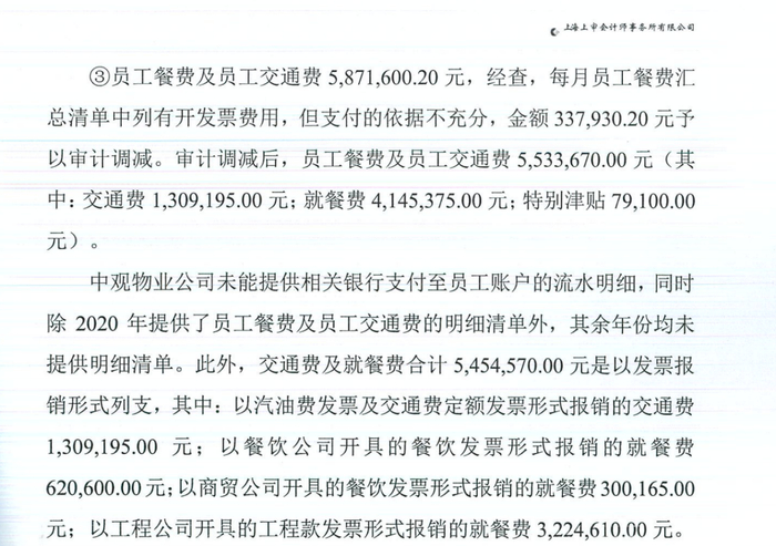 审计报告显示,中观物业未能提供相关银行支付至员工账户的流水明细,同时仅提供了2020年的员工餐费及员工交通费明细清单。合计约545万元的交通费及餐费以发票报销形式列支,其中以汽油费发票及交通费定额发票形式报销交通费约131万元,以餐饮公司开具的餐饮发票形式报销餐费约62万元;以商贸公司开具的餐饮发票形式报销餐费约30万元;以工程公司开具的工程款发票形式报销餐费约322万元。