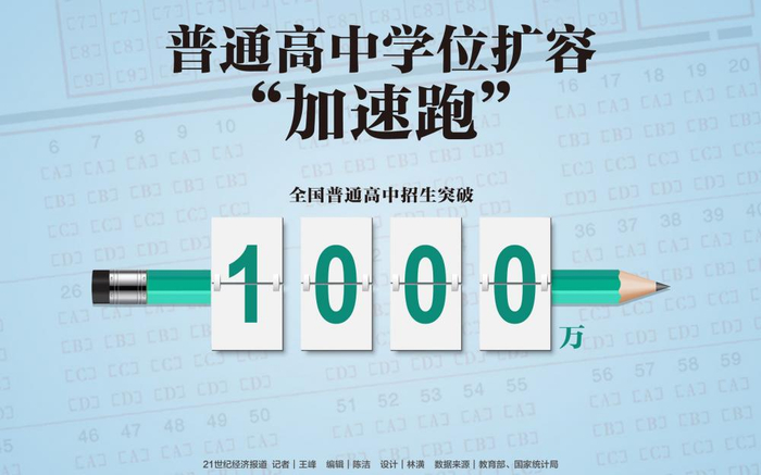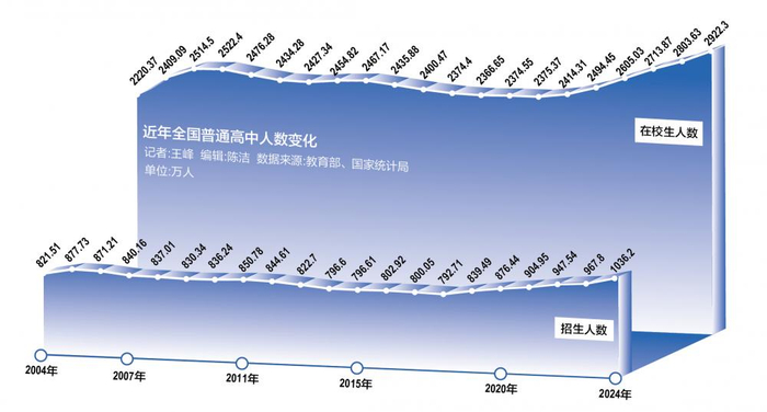 国家统计局今年2月28日发布的《2024年国民经济和社会发展统计公报》显示,2024年,全国普通高中招生1036.2万人,首次突破1000万人,比上年增加68.4万人,是上年增幅的三倍多,且增幅为20年来之最;在校生2922.3万人,比上年增加118.7万人,按照这个增速,2025年高中在校生有望突破3000万人。