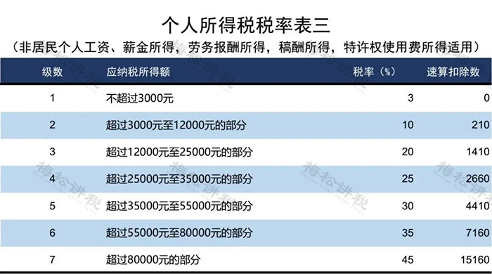 4.非居民个人工资、薪金所得;劳务报酬所得;稿酬所得;特许权使用费所得税率表