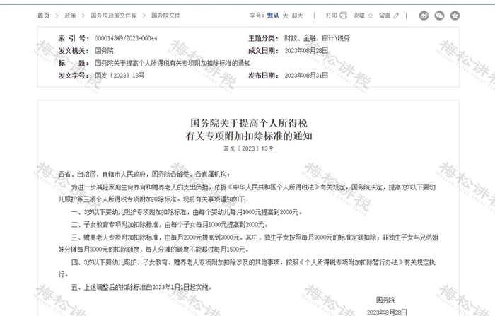 为进一步减轻家庭生育养育和赡养老人的支出负担,根据国务院《关于提高个人所得税有关专项附加扣除标准的通知》,自2023年1月1日起提高3岁以下婴幼儿照护、子女教育、赡养老人三项个人所得税专项附加扣除标准。