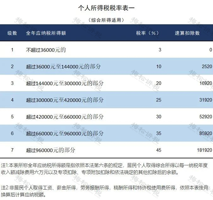 综合所得是指居民个人取得的工资、薪金所得,劳务报酬所得,稿酬所得和特许权使用费所得,适用百分之三至百分之四十五的超额累进税率(预扣率表见前述一、二)。