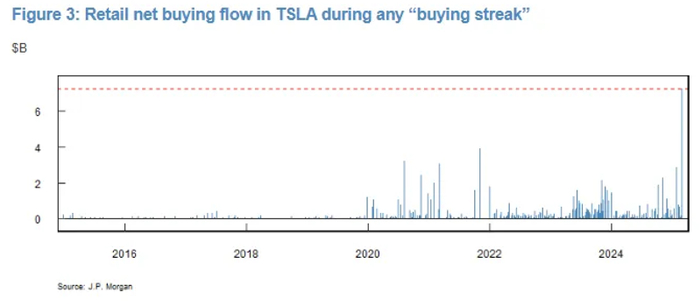 根据Emma Wu的数据,截至周四,散户连续13个交易日净买入特斯拉股票,累计投入资金达80亿美元。这是自2015年以来任何一次买入潮中最大的一笔资金流入。