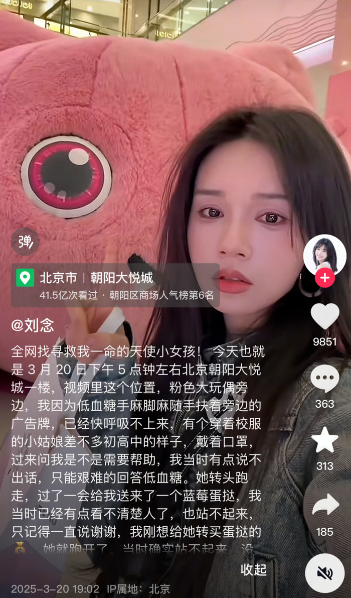 3月20日,演员刘念发视频称:“在北京朝阳大悦城一楼,因为低血糖手麻脚麻已经快呼吸不上来,有个穿着校服的小姑娘问我是不是需要帮助,我只能艰难的回答低血糖。她转头跑走,过了一会给我送来了一个蓝莓蛋挞,随后离开。当时确实站不起来,也没追上。缓过来后跑遍了大悦城都没找到她,我现在已经平安到家。祝你学业有成,健康平安。”