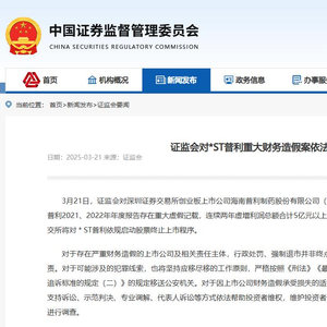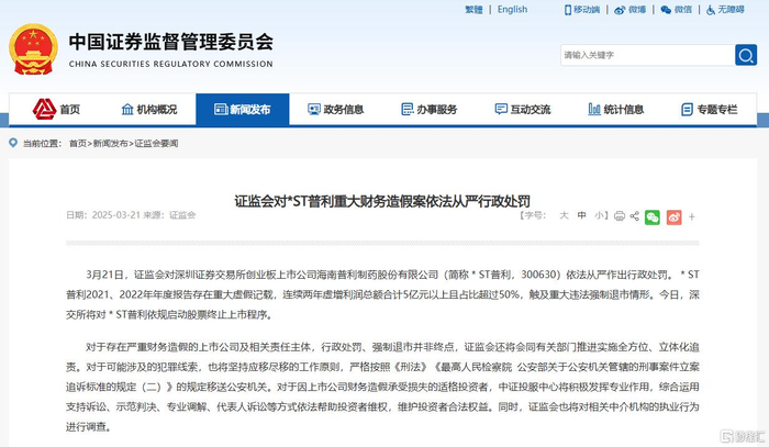3月21日,证监会对深圳证券交易所创业板上市公司海南普利制药股份有限公司(简称*ST普利)依法从严作出行政处罚。