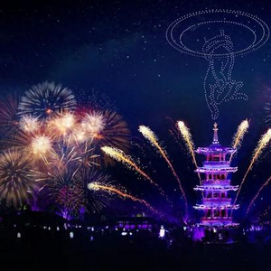 夜幕降临,伴随着禅音乐声响起,一座参照拈花塔的肌理、高24.75米的AI塔在暮色中亮灯。塔身周边水雾瞬间幻化为立体画卷,各种场景随音乐节奏流转。随后1500架无人机以塔为轴,在夜空中执笔:时空之环下,拈花一指从夜空中缓缓降下,触达塔尖刹那,巨大的蓝莲花焰火瞬间触发,在塔顶绽放,蓝色焰火如星河般倾泻而下,与地面升腾的银色烟花交汇,如星雨坠落,当星雨余烬仍在半空流转,万千光点骤然升腾重组,在云端晕染出流动的诗意宣言——“拈花一笑,为你花开满城”。
