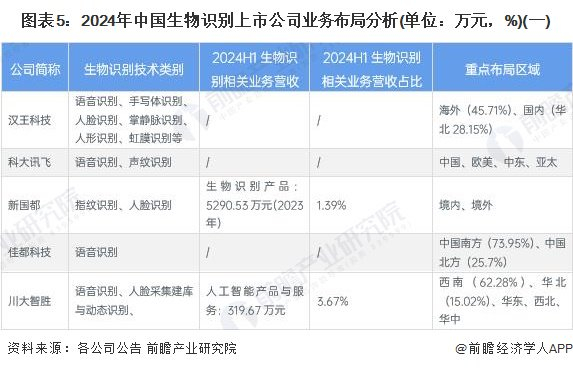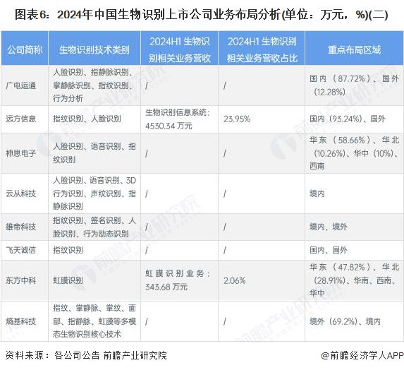 从上市公司业务布局看,各企业全球化布局程度较高,其中汉王科技与熵基科技分别侧重海内外市场,其余企业侧重国内市场;从业务布局专注度来看,各企业生物识别业务占比不高,其中远方信息生物识别系统2024年上半年营收占比23.95%,业务专注度领先;从生物识别技术布局来看,人脸识别、语音识别、指纹识别技术布局企业数量较多,虹膜识别、掌静脉识别等技术布局企业相对较少。从生物识别业务规模来看,远方信息生物识别系统营收规模相对较高,2024年上半年为4530.34万元,占比23.95%,业务专注度领先。各企业业务布局具体如下: