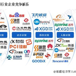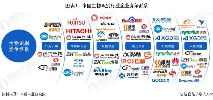 生物识别竞争派系主要包括人脸识别、指纹识别、语音识别、虹膜识别、掌静脉识别以及行为识别;其中人脸识别应用广、潜力大,指纹识别成熟低价,布局企业数量较多,代表性企业包括旷视科技、川大智胜、远方信息等;语音识别代表性企业有科大讯飞、汉王科技等;虹膜识别精准度高、难伪造,国内代表性企业有熵基科技、中科虹霸等;掌静脉识别安全准确,只是设备体积大、成本高,代表性企业有汉王科技、熵基科技等;行为识别尚处发展初期,少数先锋企业探索其在安防、交通领域应用,如广电运通、雄帝科技等。