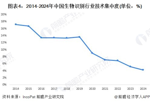 随着人脸识别、语音识别、指纹识别、虹膜识别、掌纹识别等生物识别技术的发展及应用领域的扩展,越来越多的传统安防企业、互联网公司以及其他科技企业纷纷涉足生物识别领域,市场竞争进一步加剧。从生物识别技术专利申请角度来看,2014-2024年,生物识别技术专利申请集中度呈现显著下降趋势,生物识别技术领域的竞争激烈程度不断提高。