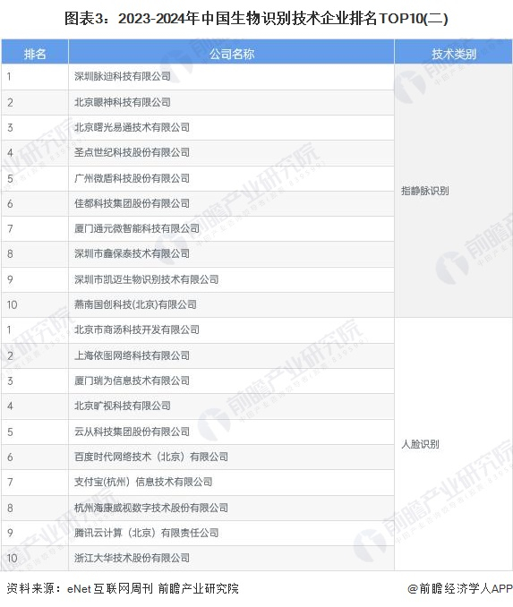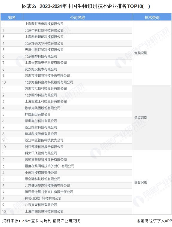 随着生物识别技术的发展,人脸识别、指纹识别、虹膜识别、语音识别等识别技术已经广泛应用于金融、安防、交通、智能家居等场景和领域中发挥着重要作用。根据互联网周刊发布识别技术公司排行名单,2023-2024年中国生物识别技术企业排名TOP10企业具体如下:
