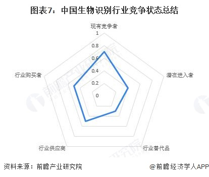 根据以上分析,对各方面的竞争情况进行量化,1代表最大,0代表最小,目前我国生物识别行业五力竞争总结如下: