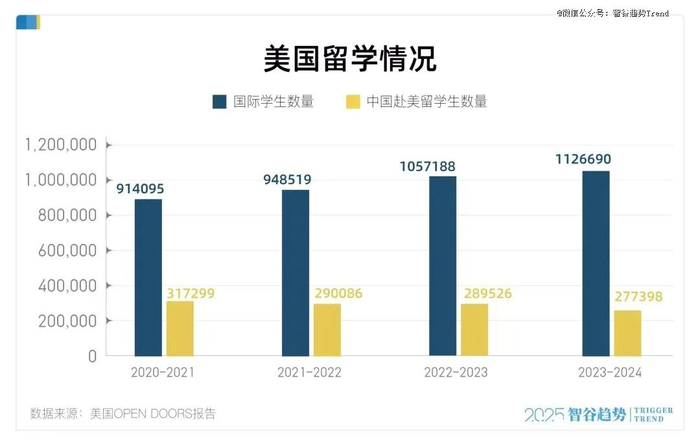 我们用一组数据对比着来看。美国权威信息库OPEN DOORS数据显示,在2020年到2024年期间,美国全部的国际学生人数从不足92万增加到将近113万人,增长了约23.26%。而中国赴美留学人数却持续下降,早就跌破30万,2020-2021与2023-2024两个学年比较之下,减少了12.58%。