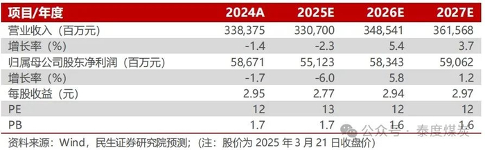 公司经营稳健,考虑煤价、电价下移,我们预计2025-2027年归母净利润为551.23/583.43/590.62亿元,对应EPS分别为2.77/2.94/2.97元/股,对应2025年3月21日的PE分别为13/12/12倍。维持“推荐”评级。