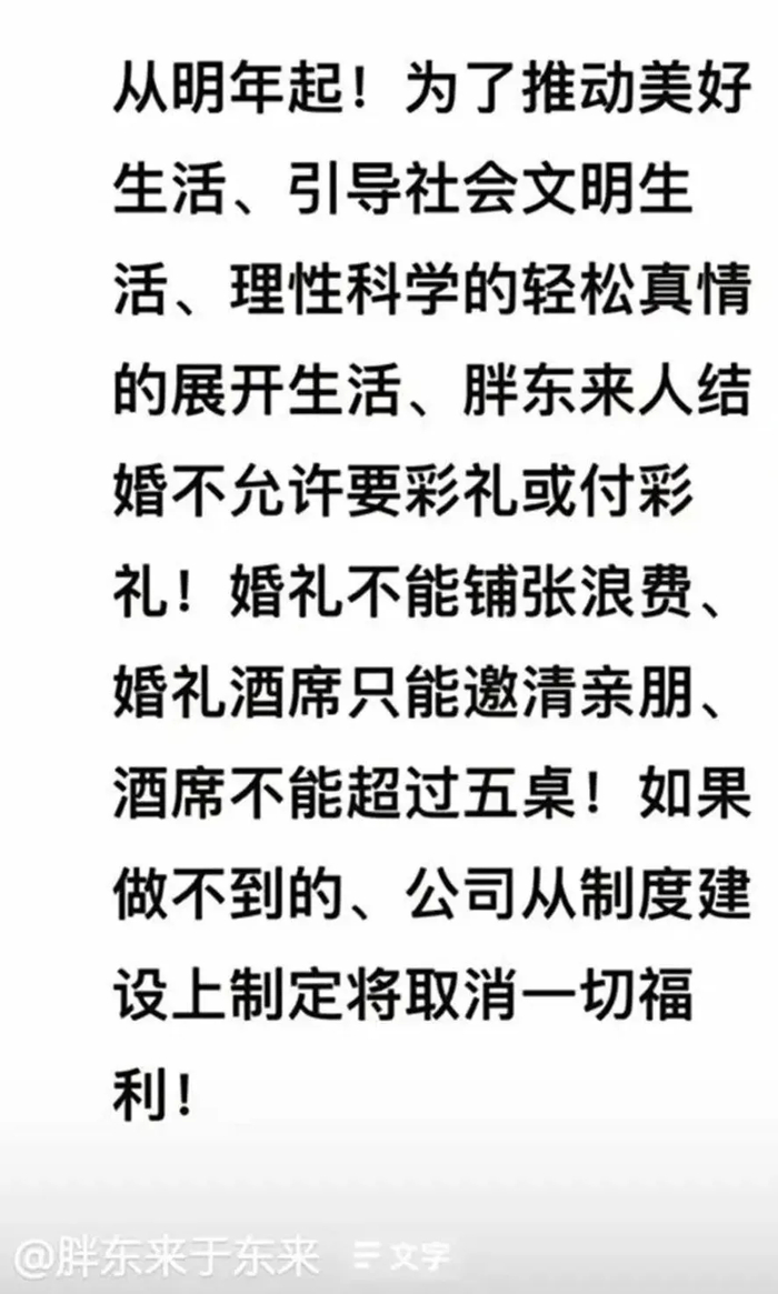 胖东来创始人于东来在社交媒体上发表对于员工婚礼的要求