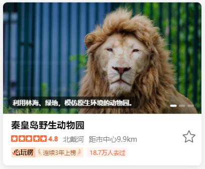 秦皇岛野生动物园座落北戴河海滨国家森林公园内,与浅水湾浴场隔路相望,步行2分钟即可到达。园区放养着120余种4000余头来自世界各地的珍禽名兽和国家一、二级保护动物。是目前我国城市规划中,占地面积大、森林覆盖率高、自然环境优美的野生动物园。