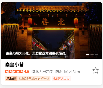 秦皇小巷美食文化旅游街区由美食街区、市集文创街区、秀场娱乐街区组成,拥有地方特色美食、传统手工艺、文化创意等百余种品牌,非遗、名吃等商品千余种,是一条集吃、喝、玩、乐、购于一体的多业态古风艺术街区。