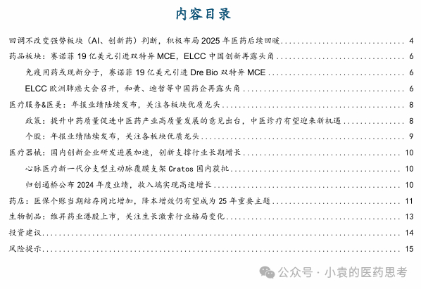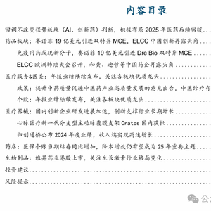 药品板块:赛诺菲19亿美元引进双特异MCE,ELCC中国创新再露头角。诸多中国药企,不仅海外授权交易不断展露创新资产价值潜力,而且在2024年的销售业绩与授权收入上都有靓丽表现。随着中国科技实力的全球认知提升,中国药企创新实力及其成长空间也开始被资本市场重新关注。看好本土原研“真创新”类药企,也看好国际化高水平引进能力领先的药企标的。