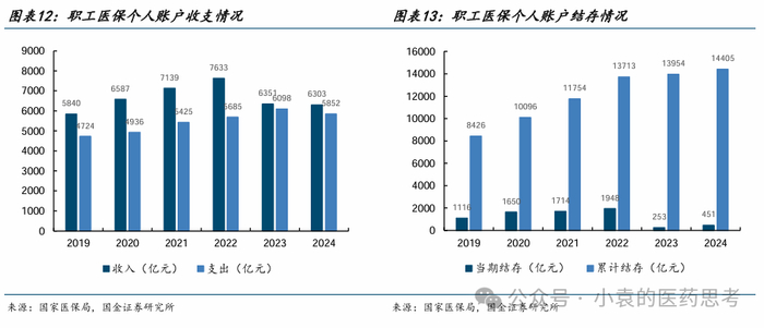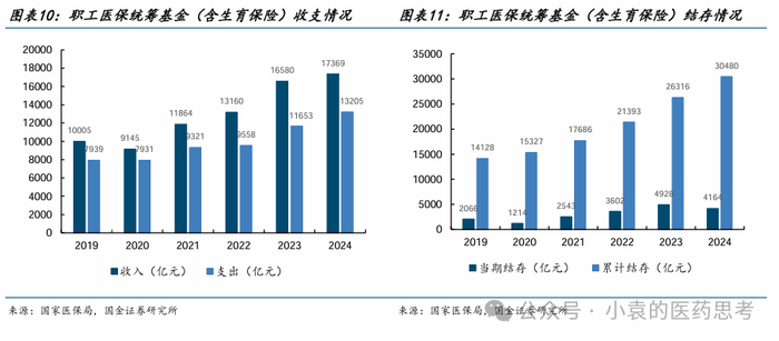 2025年3月21日,国家医保局发布《2024年医疗保障事业发展统计快报》,2024年职工基本医疗保险基金(含生育保险)收入23671.59亿元,同比+3.2%,支出19056.55亿元,同比+7.4%。其中:统筹基金收入17368.93亿元,同比+4.8%,支出13205.04亿元,同比+13.3%;相应地,个人账户收入6303亿元,同比-0.8%,支出5852亿元,同比-4.0%。