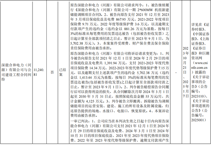 科陆电子与深能合和电力(河源)有限公司储能调频项目纠纷已结案。科陆电子向原告深能合和电力(河源)有限公司赔偿金额合计3316.12万元,拆除、搬离其为《深能合和电力(河源)有限公司一期2*600MW机组新建储能调频项目合同》项目的运营安装、建设、施工的所有设备及附属设施,向原告深能合和电力(河源)有限公司归还提供的场地、水接口、电接口,并恢复原状。赔偿款已支付完毕,详情如下: