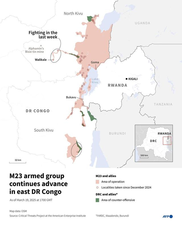 截至当地时间3月19日,“M23”运动在刚果(金)东部省份控制的地区 法新社