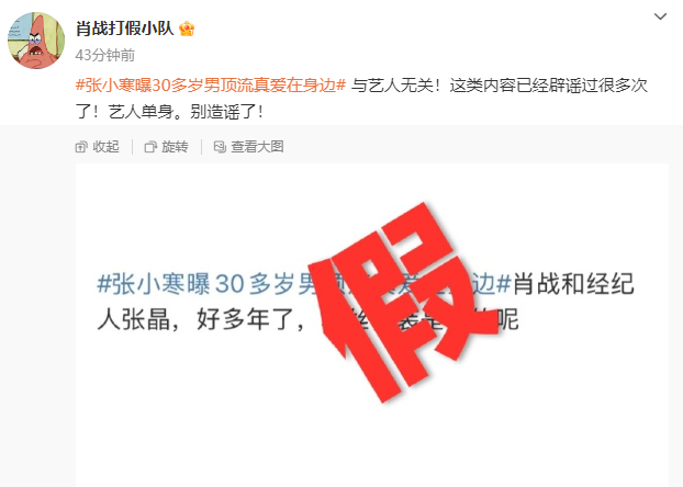 3月21日,针对话题词#张小寒曝30多岁男顶流真爱在身边# ,肖战方辟谣。