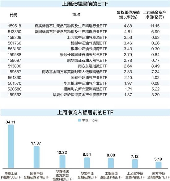 从资金流向来看,上周,共计69只ETF净流入额在1亿元以上。华夏上证科创板50ETF、国泰中证全指证券公司ETF、华泰柏瑞南方东英恒生科技ETF排名前三,净流入额依次为34.11亿元、17.37亿元、10.32亿元。