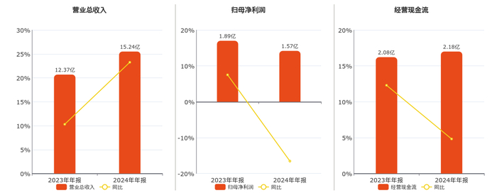 公司营业总收入为15.24亿元。归母净利润为1.57亿元,较去年同报告期归母净利润减少3118.69万元,同比较去年同期下降16.54%。经营活动现金净流入为2.18亿元。