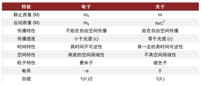 与电子相比,光子具有较高的信息容量和效率、响应能力、互联能力与并行能力。作为信息载体,可见光的频率为5*10^14Hz,而处于微波波段的电波频率仅为10^10Hz量级,因此光子可承载信息的容量比电子高出3~4个量级;同时,由于光子是玻色子,没有电荷,因此光子脉冲的脉宽能做到皮秒甚至飞秒量级,而电子脉冲脉宽最窄限度在纳秒量级,此外,光子与光子间不会产生库仑力,具有良好的空间相容性,因此对比电子其优势显著。