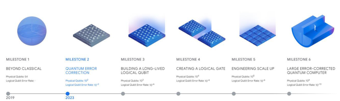 此外谷歌对于其量子计算研究设立了六个里程碑式的研发目标,希望能够通过提升复杂运算、量子纠错等计算能力释放量子计算的全部潜力,未来计划将物理量子比特数量由目前的10^2量级发展至10^6量级,将逻辑量子比特错误率由目前的10^-2量级降至10^-13量级。