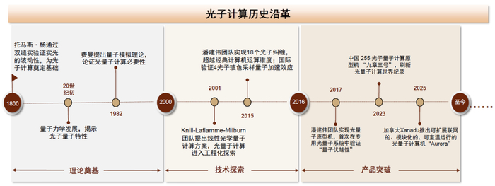 光子计算的历史可以追溯到19世纪初,并于2015年后逐步出现光子计算机原型。1801 年托马斯・杨通过双缝实验证实了光的波动性,20 世纪初,量子力学揭示光子量子特性,为光信息处理奠定理论基础。1960 年梅曼发明红宝石激光器,首次实现稳定可控的光载波,催生 1980 年代光学信息处理技术。2001年,Knill-Laflamme-Milburn团队提出线性光学量子计算方案,让光量子计算从 “不可能” 转向工程化探索,奠定了玻色采样的底层逻辑。2015年,中国科学院潘建伟团队实现 18 个光子纠缠,首次超越经典计算机的二进制运算维度,标志光量子计算从单比特操控迈向多体协同的关键跨越。同年,国际首次实验验证玻色采样的量子加速效应,单光子数达4个。2016年MIT研究团队打造了首个光子计算系统,于2017年刊登于Nature Photonics杂志,2019年Lightelligence发布首款光子芯片原型板卡,2021年发布全球首款光电混合封装光子计算芯片。2023年,中国科学技术大学潘建伟团队与多方合作,成功构建了255个光子的量子计算原型机“九章三号”,再度刷新了光量子信息的技术水平和量子计算优越性的世界纪录。