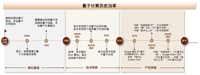 量子力学概念诞生于20世纪初,后由Google、IBM等公司不断推动其量子计算硬件产品迭代升级。量子力学最早由马克斯·普朗克、尼尔斯·玻尔、维尔纳·海森堡和埃尔温·薛定谔等科学家提出了量子力学的基本原理,1982年,物理学家理查德·费曼提出了利用量子系统模拟量子现象的想法,开创了量子计算概念的起源。随后Shor算法、量子纠错码、容错量子计算等一系列概念提出使得大规模量子计算成为可能。21世纪初,科学家们开始在各种物理系统中实现量子比特,包括超导量子比特、离子阱、光子、量子点等,2019年,Google宣布实现了“量子优越性”(Quantum Supremacy),即其量子计算机在特定任务上超越了经典计算机。2024年12月10日,Google宣布推出量子芯片Willow(共105个量子比特)在多个指标上都具有先进的性能,并破解了近30年来一直在研究的量子纠错挑战。[5]